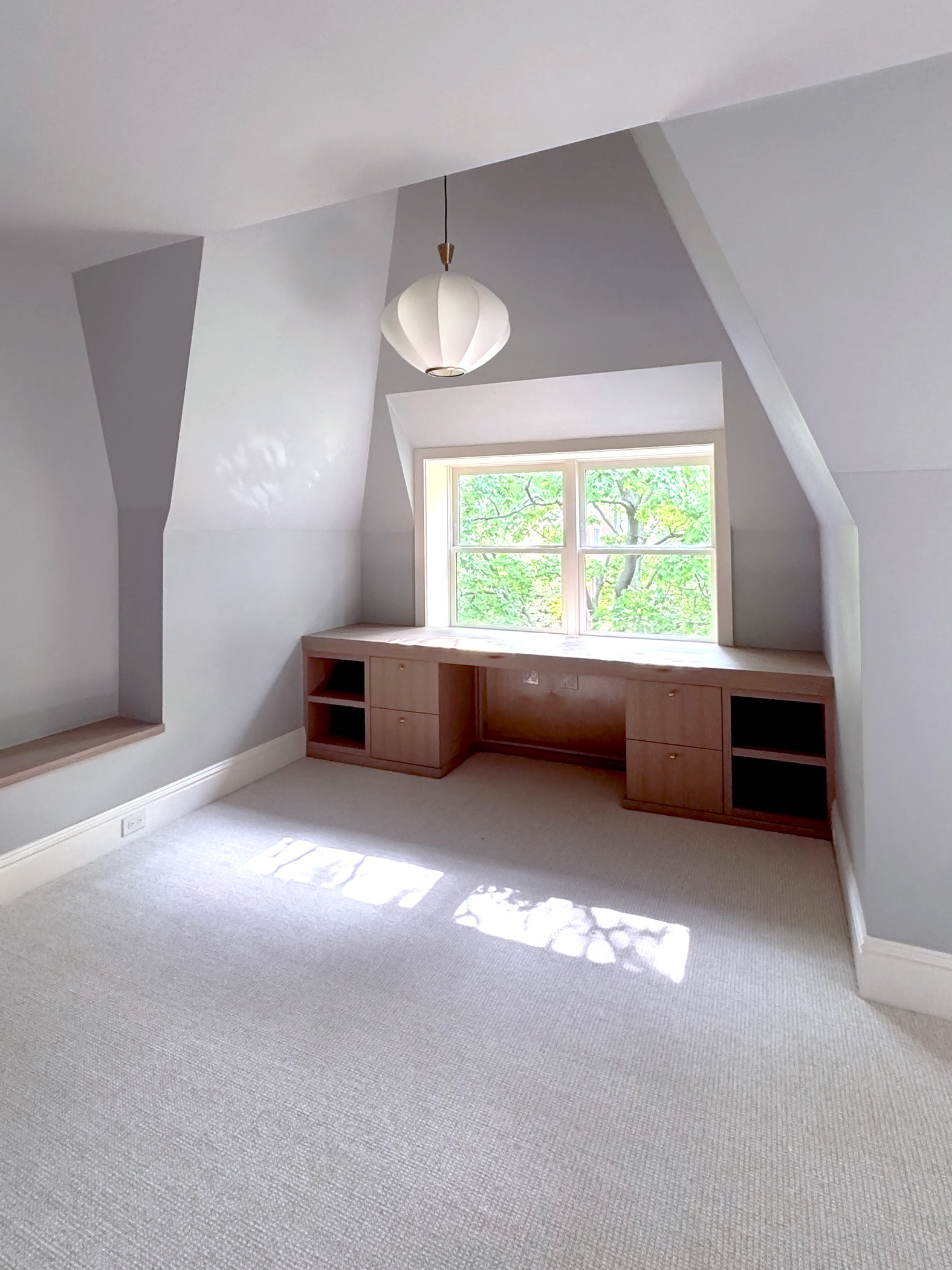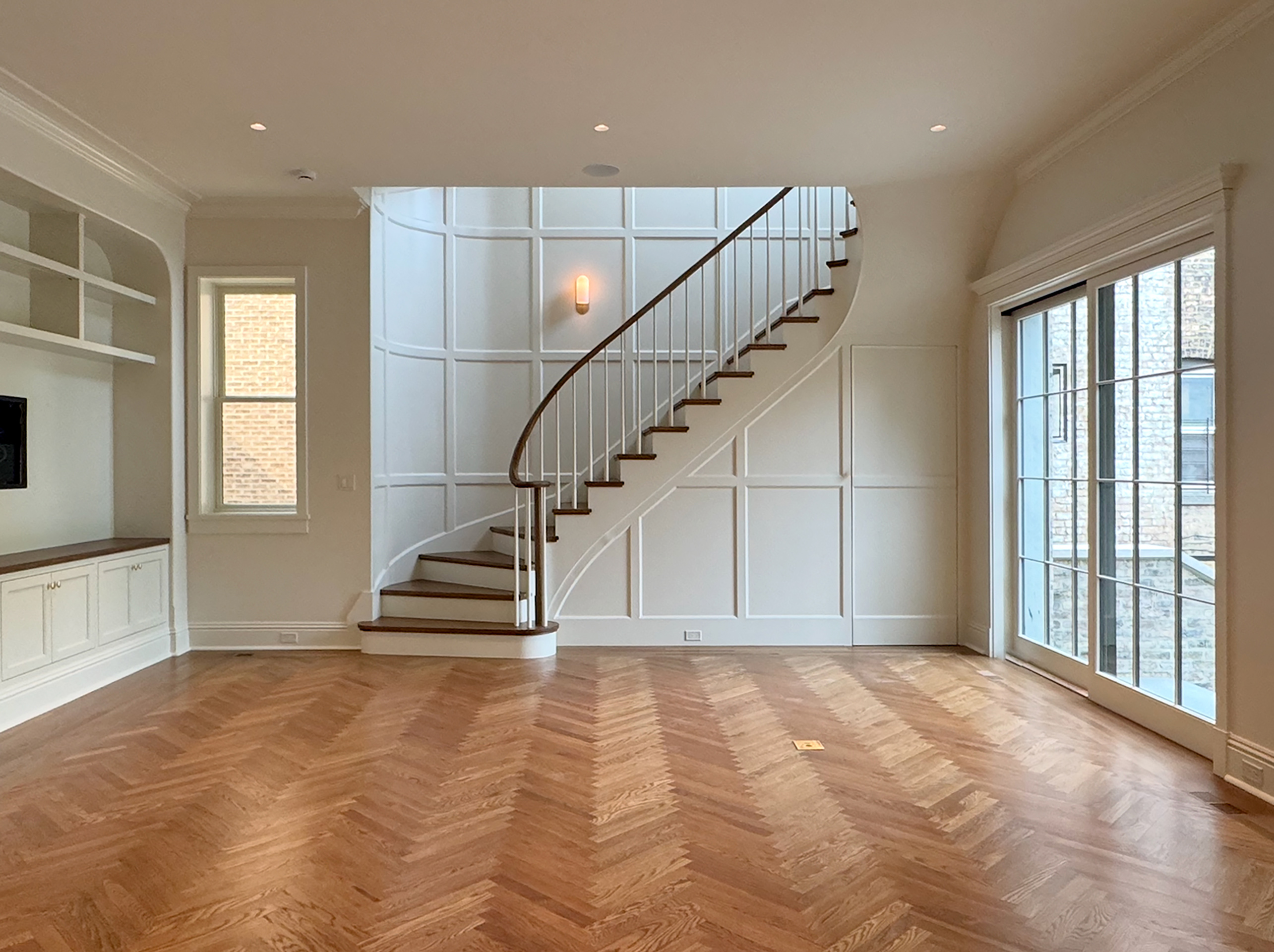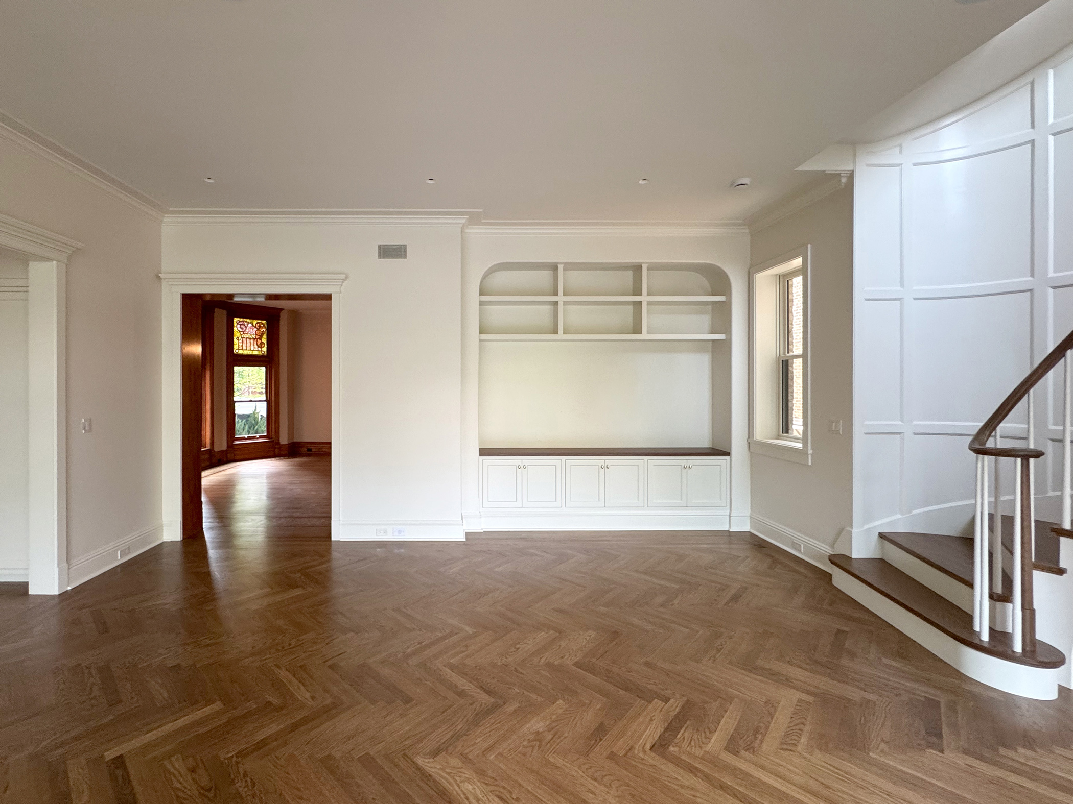 A light-filled breakfast room addition overlooks a spacious outdoor area, blurring the lines between inside and out. A new wood-paneled staircase elegantly connects the home's four levels. The kitchen, family room, rear staircase, and breakfast room, form the new core of the daily family living experience. The second floor boasts four en-suite bedrooms, while the third floor contains private workspaces, as well as a child-centric playroom with a view of the neighborhood. Learn more about our basement remodel process for this home.