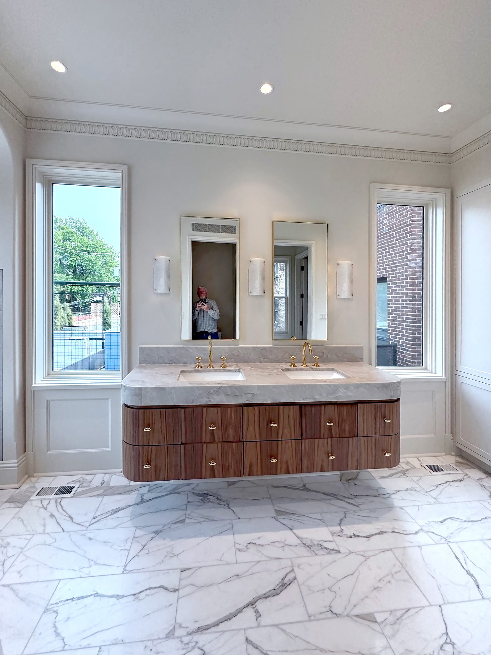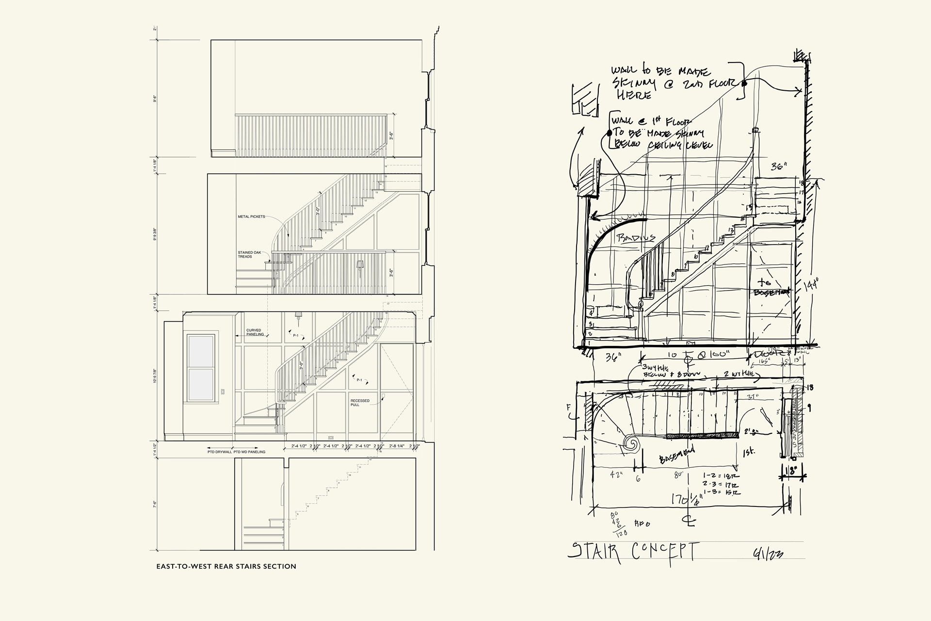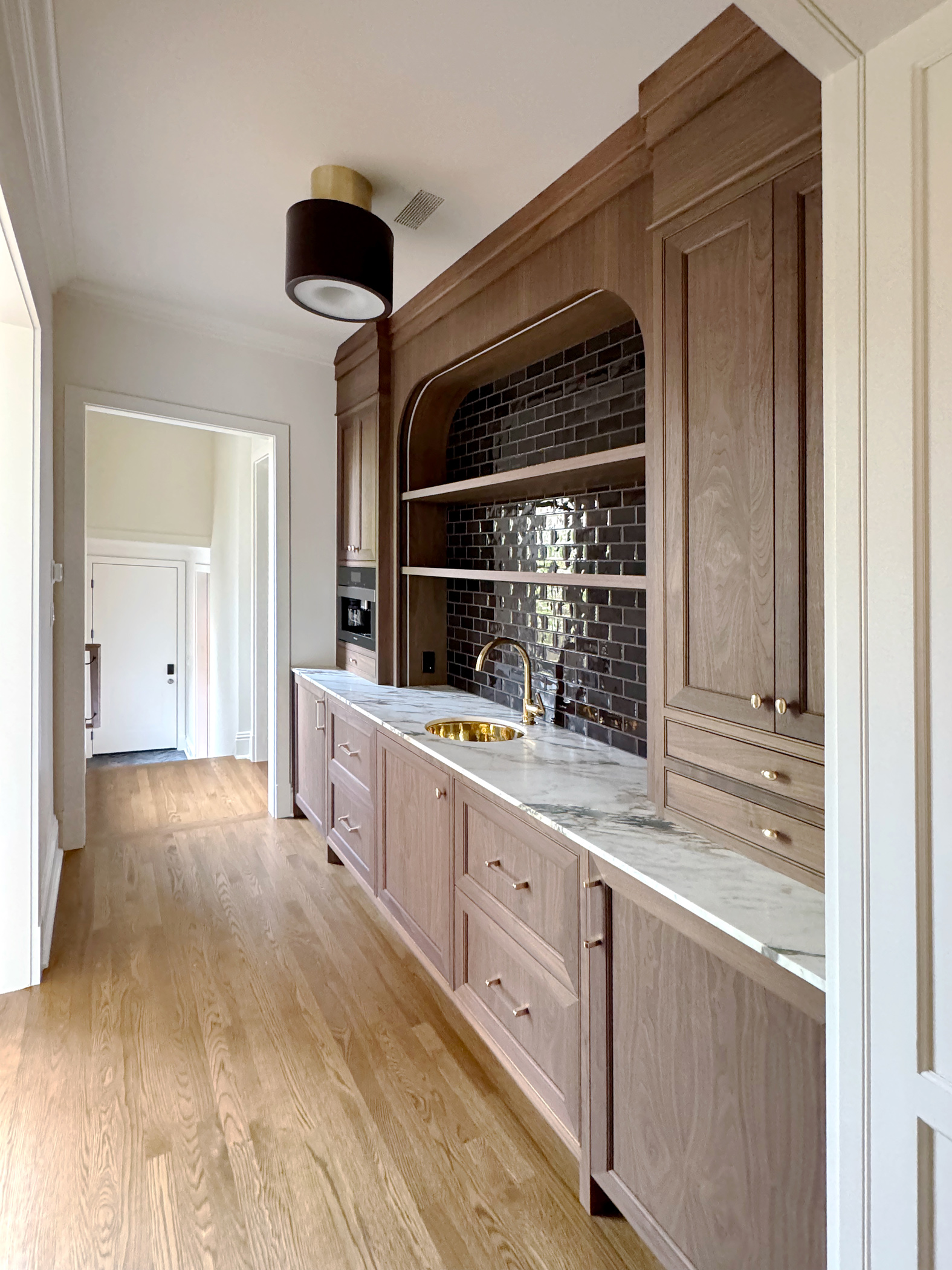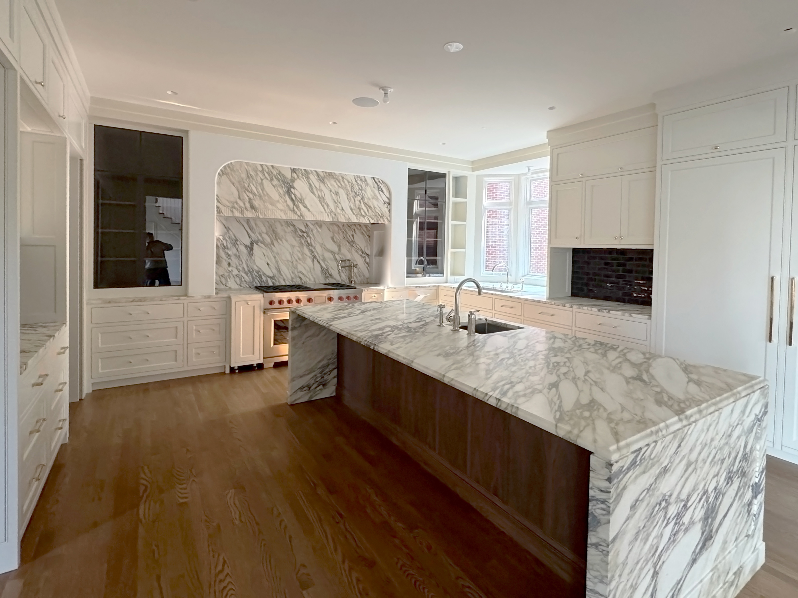 A light-filled breakfast room addition overlooks a spacious outdoor area, blurring the lines between inside and out. A new wood-paneled staircase elegantly connects the home's four levels. The kitchen, family room, rear staircase, and breakfast room, form the new core of the daily family living experience. The second floor boasts four en-suite bedrooms, while the third floor contains private workspaces, as well as a child-centric playroom with a view of the neighborhood. Learn more about our basement remodel process for this home.