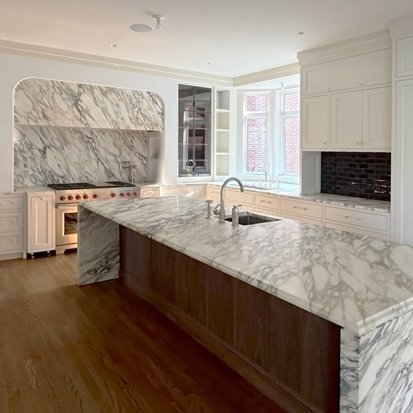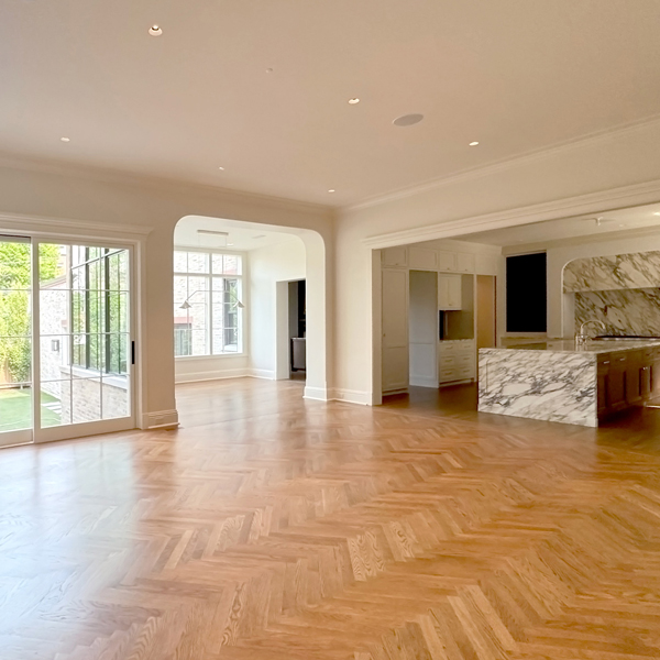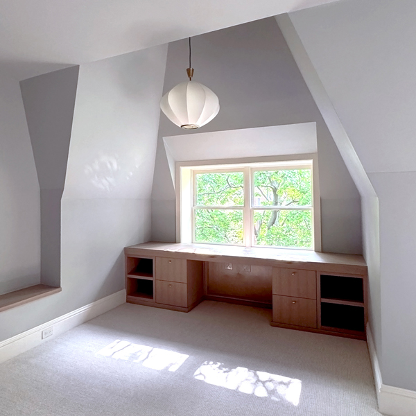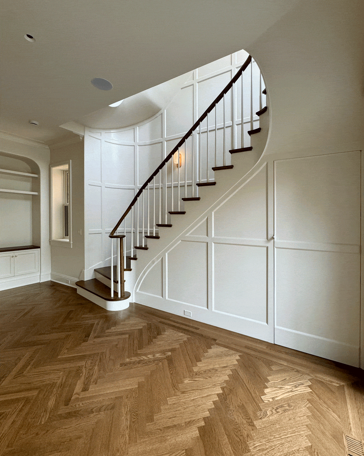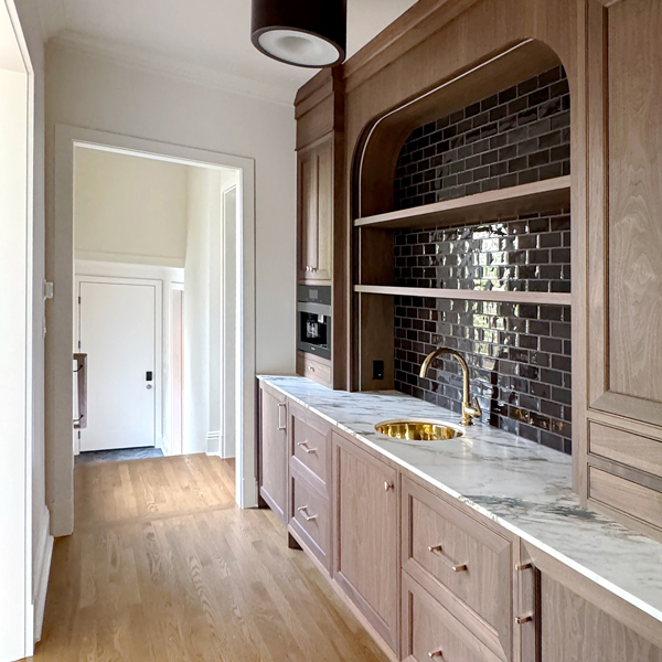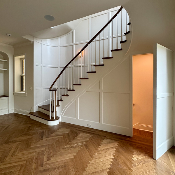 A light-filled breakfast room addition overlooks a spacious outdoor area, blurring the lines between inside and out. A new wood-paneled staircase elegantly connects the home's four levels. The kitchen, family room, rear staircase, and breakfast room, form the new core of the daily family living experience. The second floor boasts four en-suite bedrooms, while the third floor contains private workspaces, as well as a child-centric playroom with a view of the neighborhood. Learn more about our basement remodel process for this home.