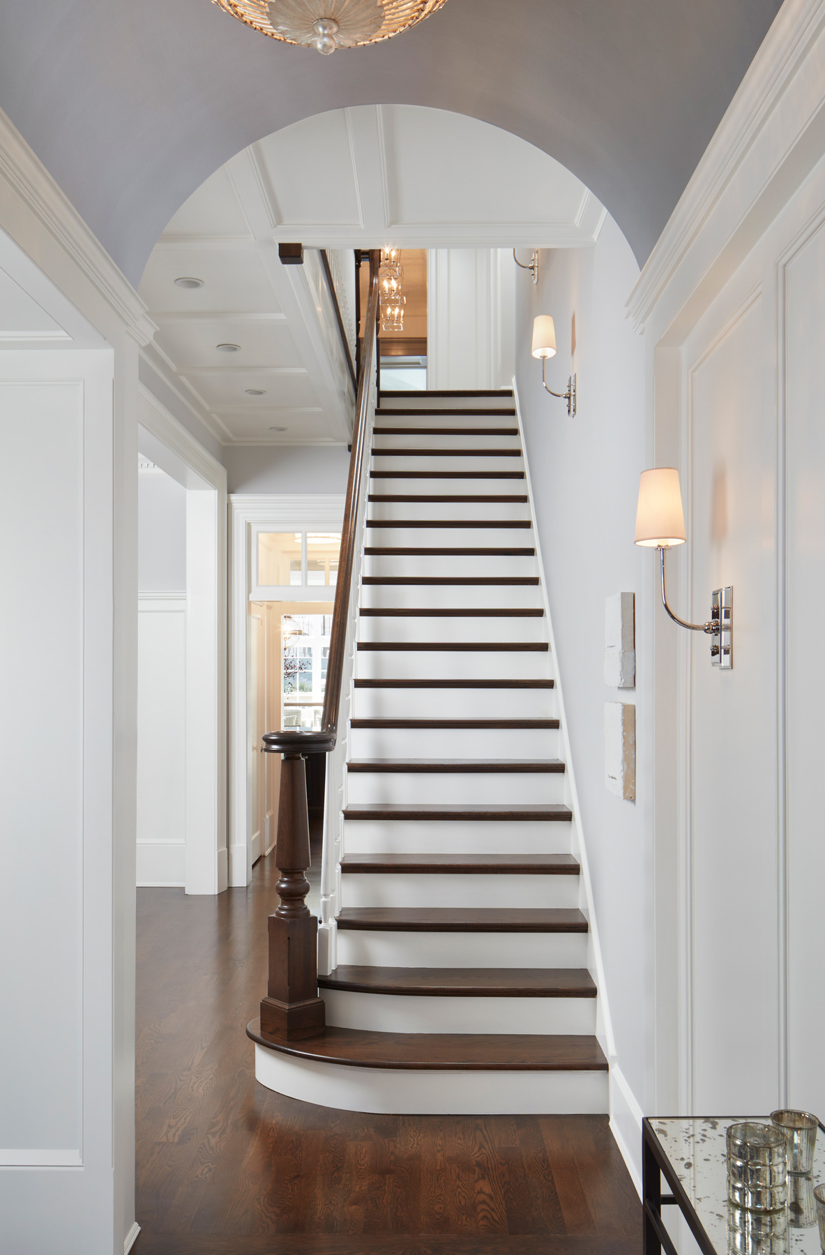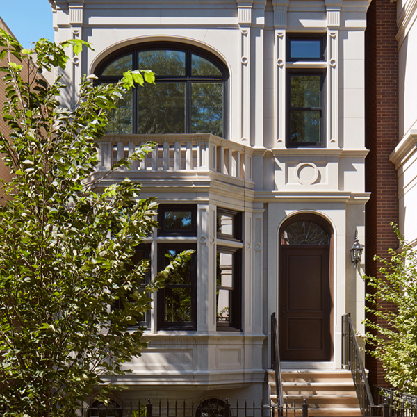 A new home with a limestone facade has taken shape in Lincoln Park. The bay window features a half round stone base that projects out from the wall plane to create a strong sculptural character. The intricate detail of the stone recalls the finesse of the great homes of the late 19th century. An elliptical arched window on the second floor is followed by a large dormer on the third level projecting through a steeply sloped slate roof. The interior reinforces the building character as the foyer ceiling continues the profile of the arched entry transom. A grand stair hall features an elliptically vaulted ceiling vestibule at the entry at the second floor master bedroom suite. South facing windows at the fourth floor flood the stair hall with natural light.