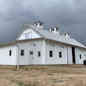 A traditional timber frame barn, made with long grain dougalass fir with white board & batten exterior.