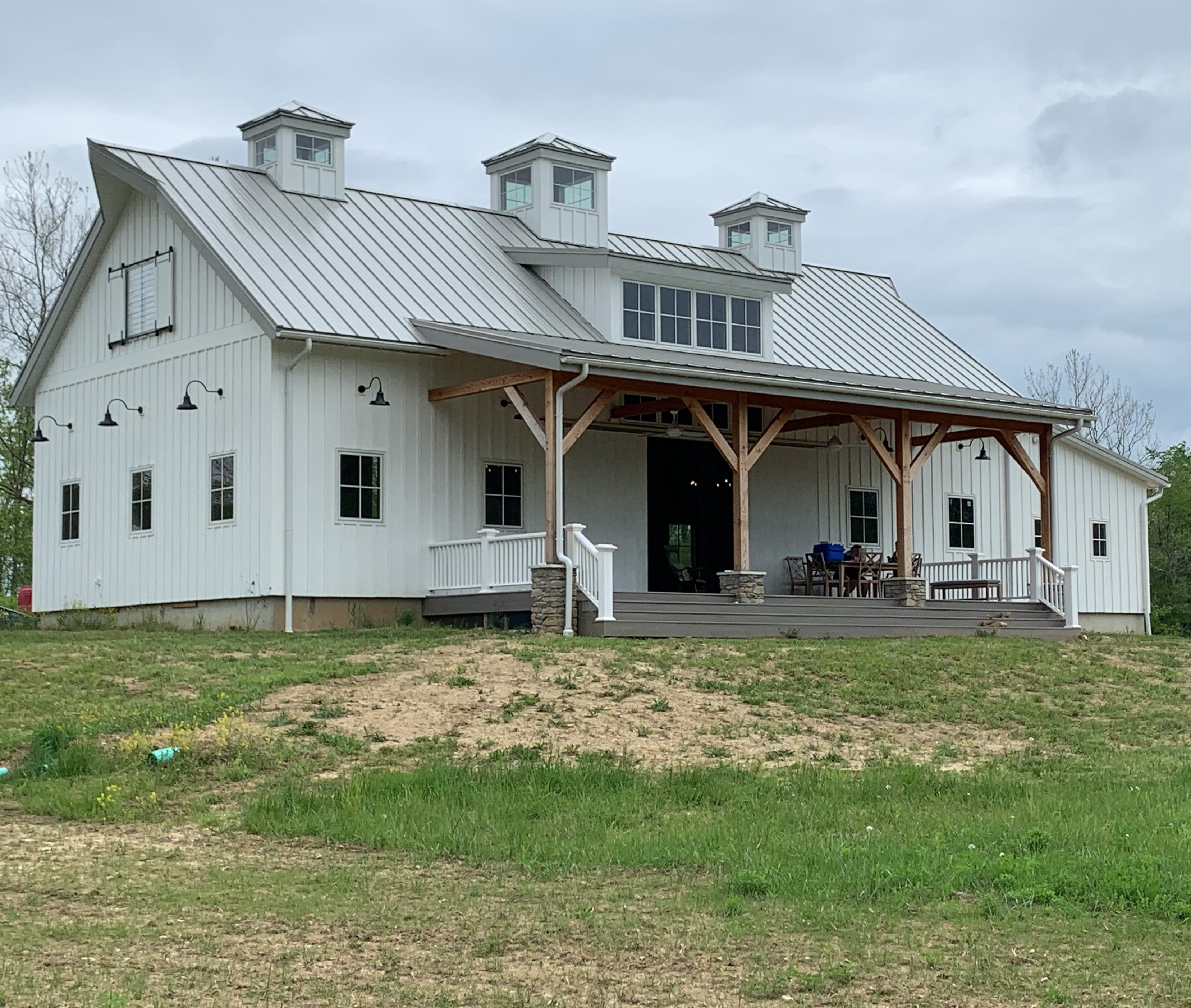 A traditional timber frame barn, made with long grain douglas fir and white board & batten exterior.