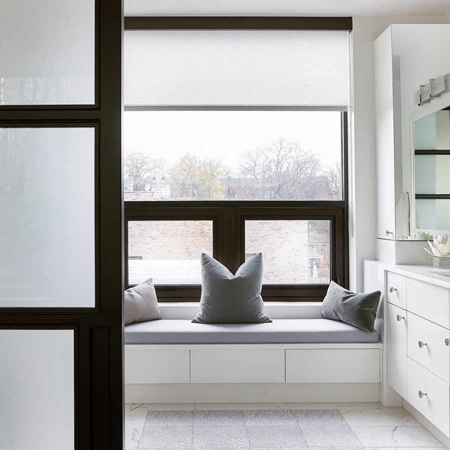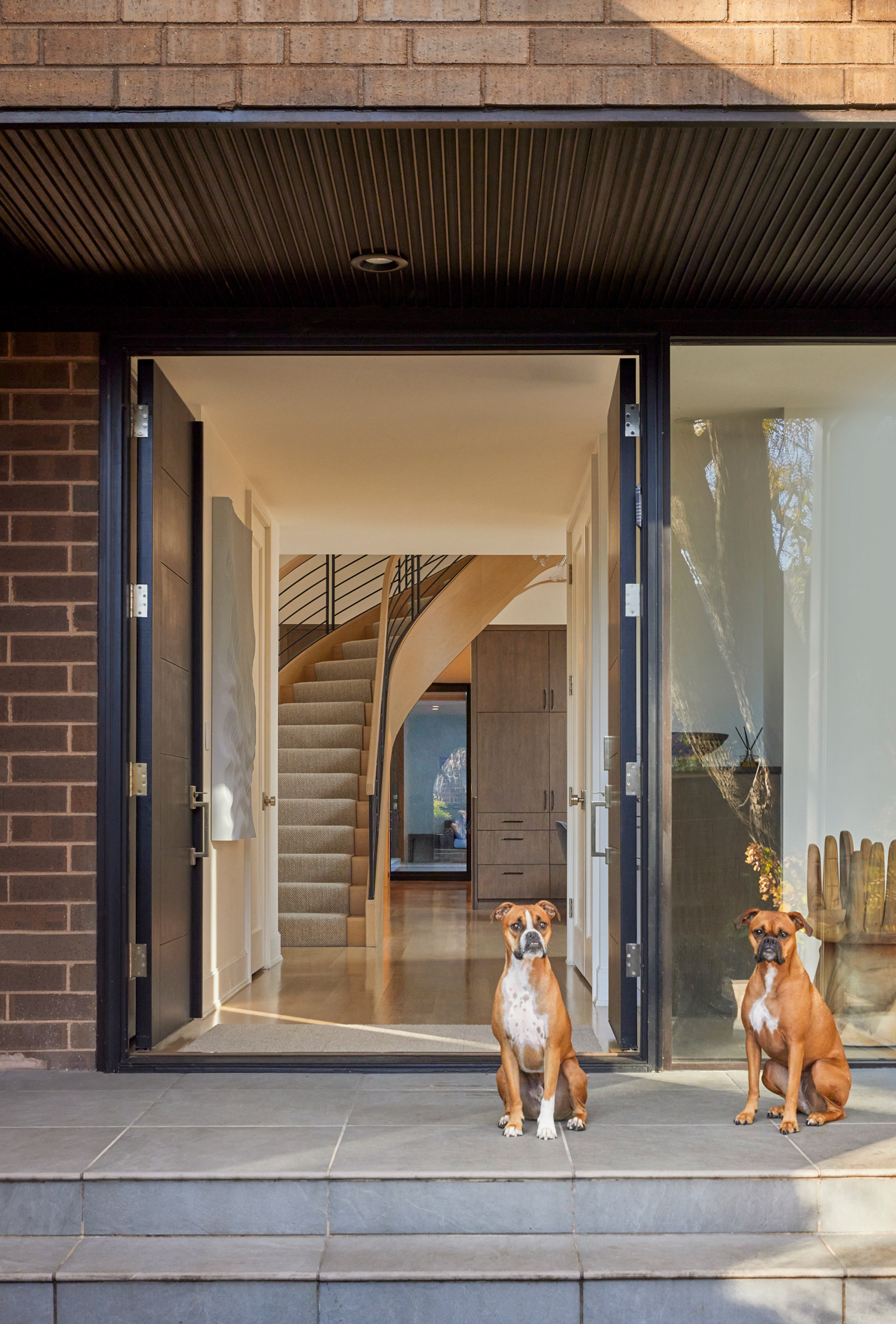 A large window wall floods the four-story stairwell with natural light. At the second level, a glass bridge traverses the space and joins the children’s and parents' wings. A retractable skylight above an indoor pool brings abundant light into the pool and adjacent kitchen and family rooms. A workout room accessed through the pool room was excavated in the footprint of an existing garage structure. Sitting rooms on each floor adjacent to the stair hall extend views and natural light through the home.