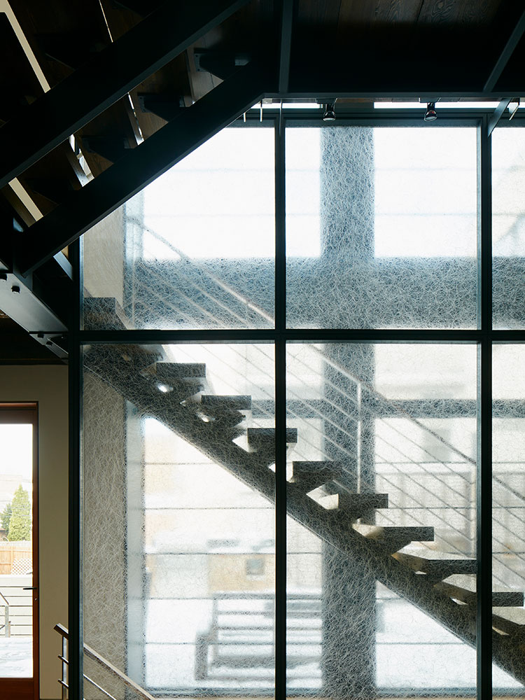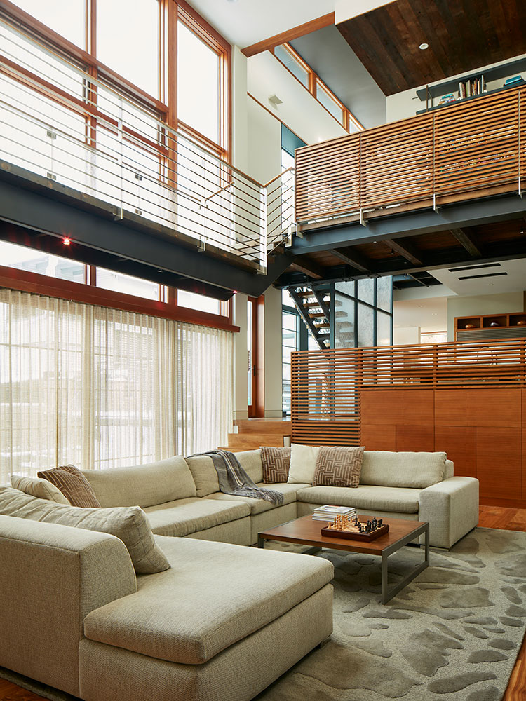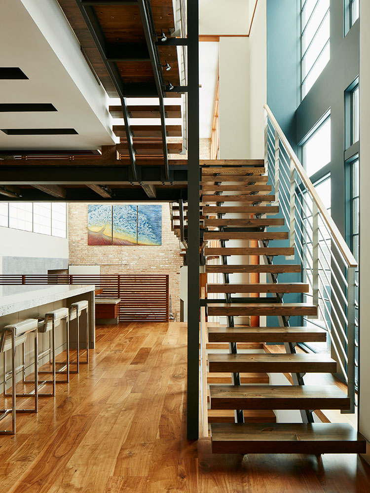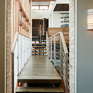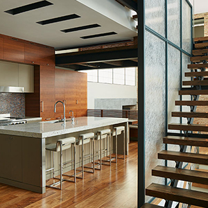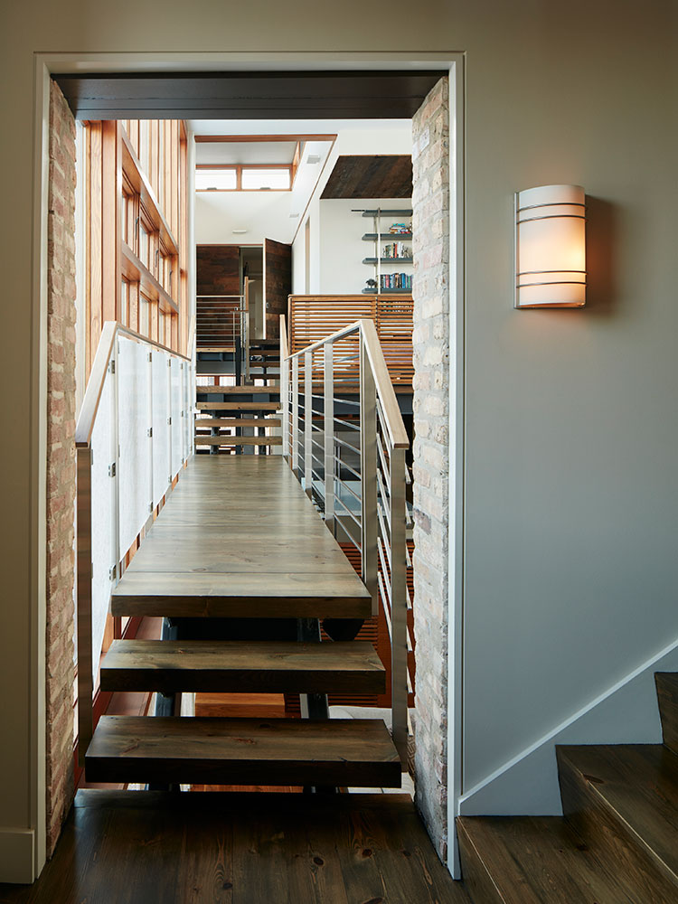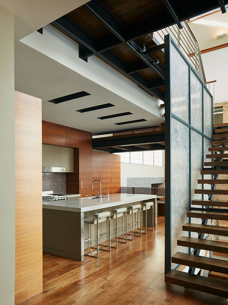 This new construction home was added to the front of a two-story warehouse building. Materials were salvaged and reused from the deconstruction of an existing adjacent home. A glass room joins the old and the new. A steel framed loft, stair structure and bridges navigate the various floor levels. The 4-inch thick wood decking and stair treads were fabricated from beams salvaged from the original house. Resin screen panels with aluminum filaments provide a railing and privacy panel for the stair and kitchen. The panels are also used along one side of the bridge over the family room. A raised terrace extends the interior space to the exterior and yard beyond.