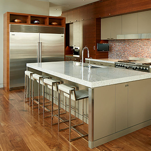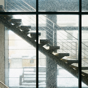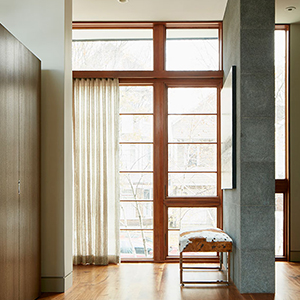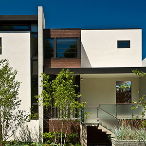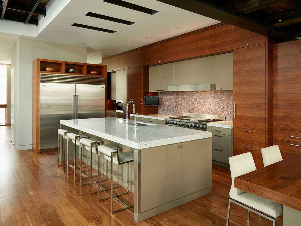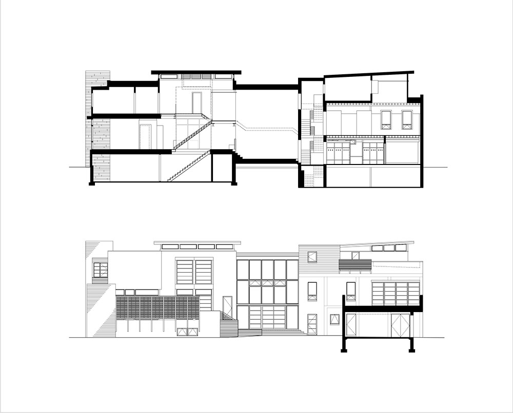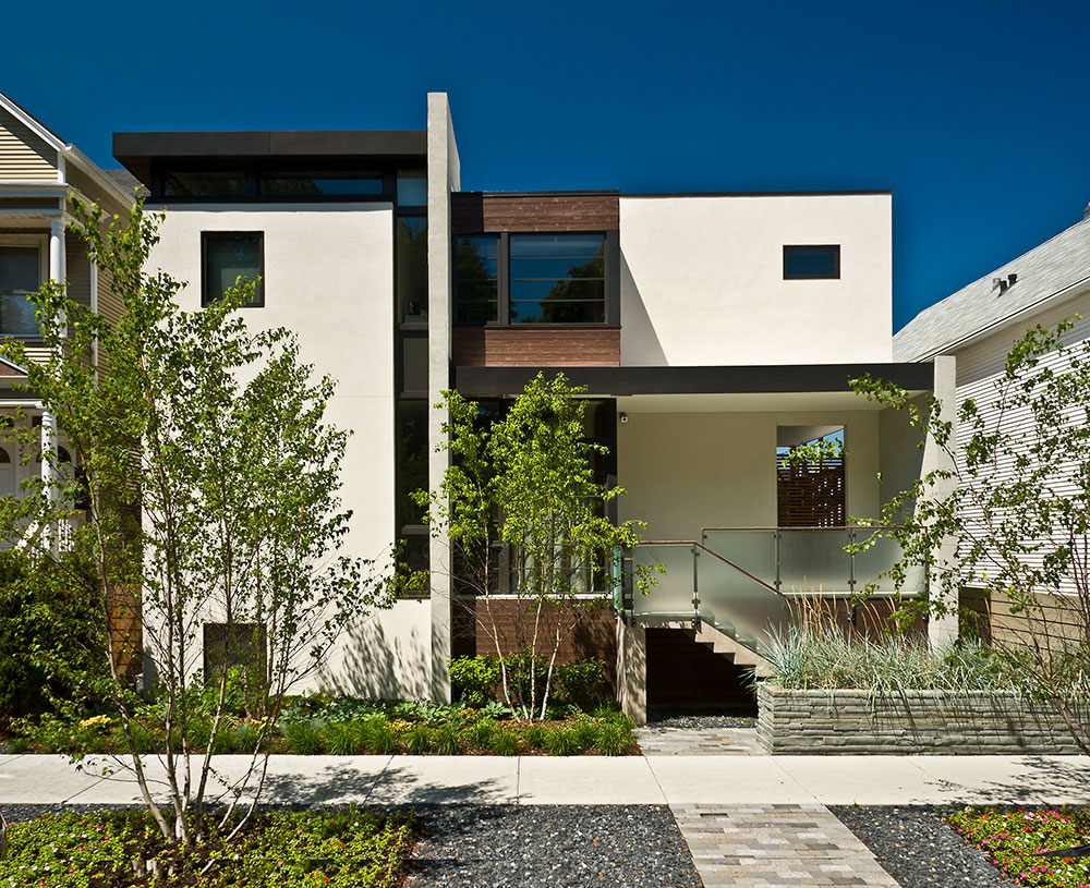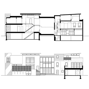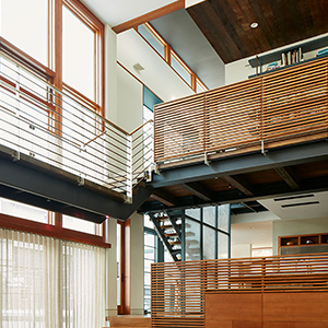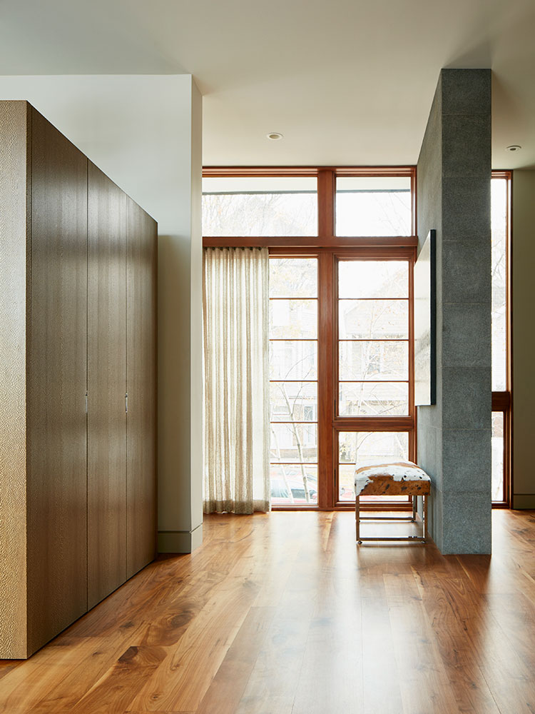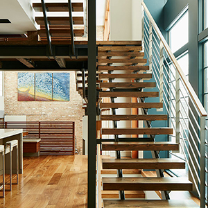 This new construction home was added to the front of a two-story warehouse building. Materials were salvaged and reused from the deconstruction of an existing adjacent home. A glass room joins the old and the new. A steel framed loft, stair structure and bridges navigate the various floor levels. The 4-inch thick wood decking and stair treads were fabricated from beams salvaged from the original house. Resin screen panels with aluminum filaments provide a railing and privacy panel for the stair and kitchen. The panels are also used along one side of the bridge over the family room. A raised terrace extends the interior space to the exterior and yard beyond.