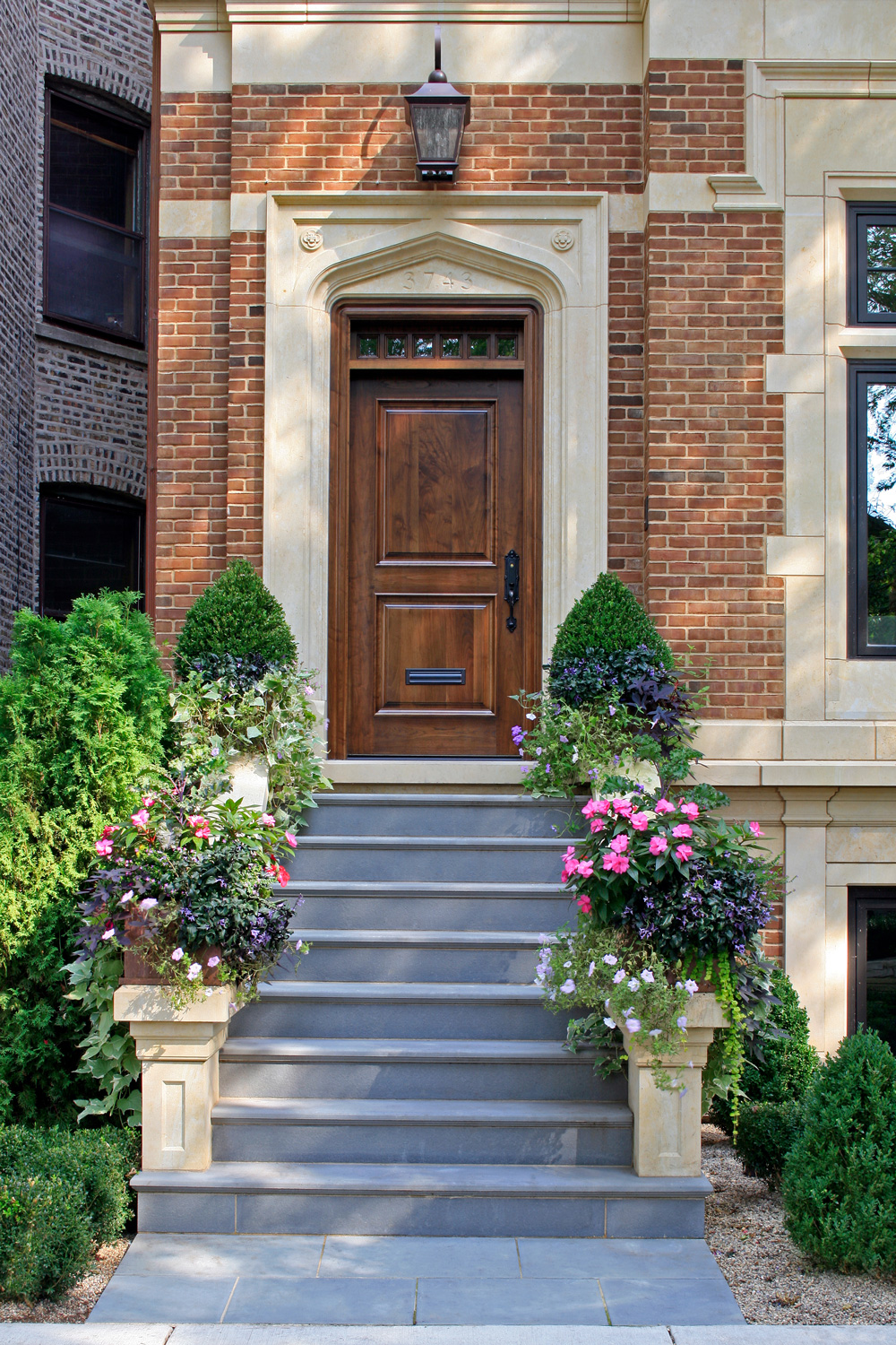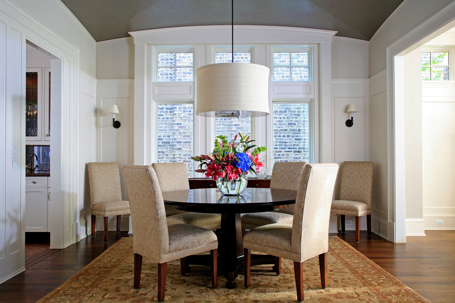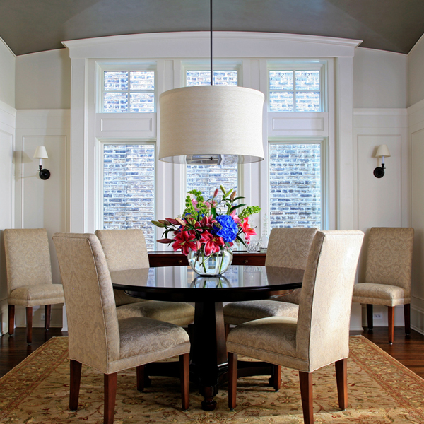 The wide city lot created an opportunity for a light filled traditional home. Broad bands of tripartite windows with transoms grace the principal rooms. Formal entry and stair halls allow living and dining spaces to sidestep the circulation through the house. The stair features a continuous walnut handrail ribbon from top to bottom and is illuminated from skylights and windows on the third floor. The wide plan also affords a gracious vaulted kitchen that opens onto a light filled breakfast, family room and rear stair hall. An ample rear yard garden is accessed via a glass walled link between the house and garage.