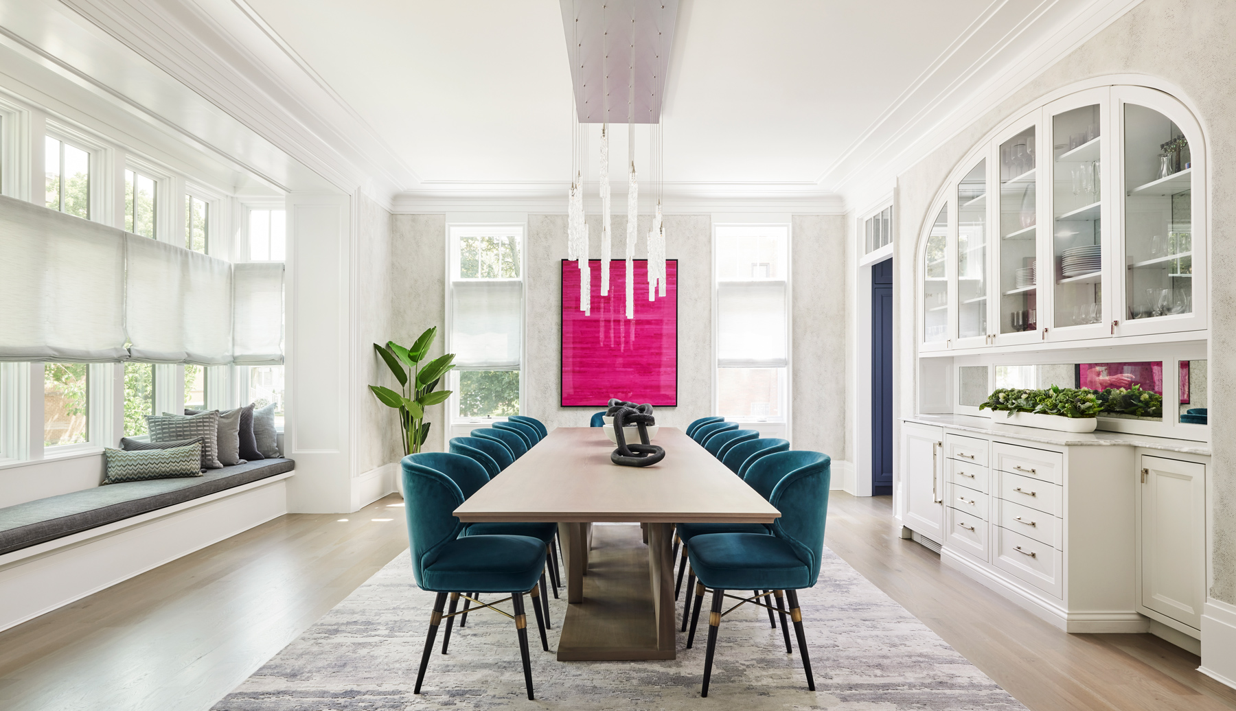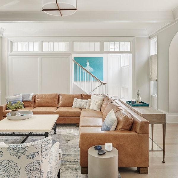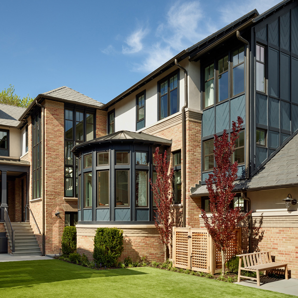 Situated along the perimeter of the property, this unique home creates a continuous street wall, both preserving plenty of open yard space and maintaining privacy from the prominent street corner. A one-story mudroom connects the garage to the house at the rear of the lot which required a local zoning variance. The resulting L-shaped plan and the central location of a glass-enclosed stair allow natural light to enter the home from multiple sides of nearly every room. The Arts & Crafts inspired detailing creates a familiar yet unique facade that is sympathetic to the character and scale of the neighborhood. A chevron pattern is a key design element on the window bays and doors and continues inside throughout the interior of the home.